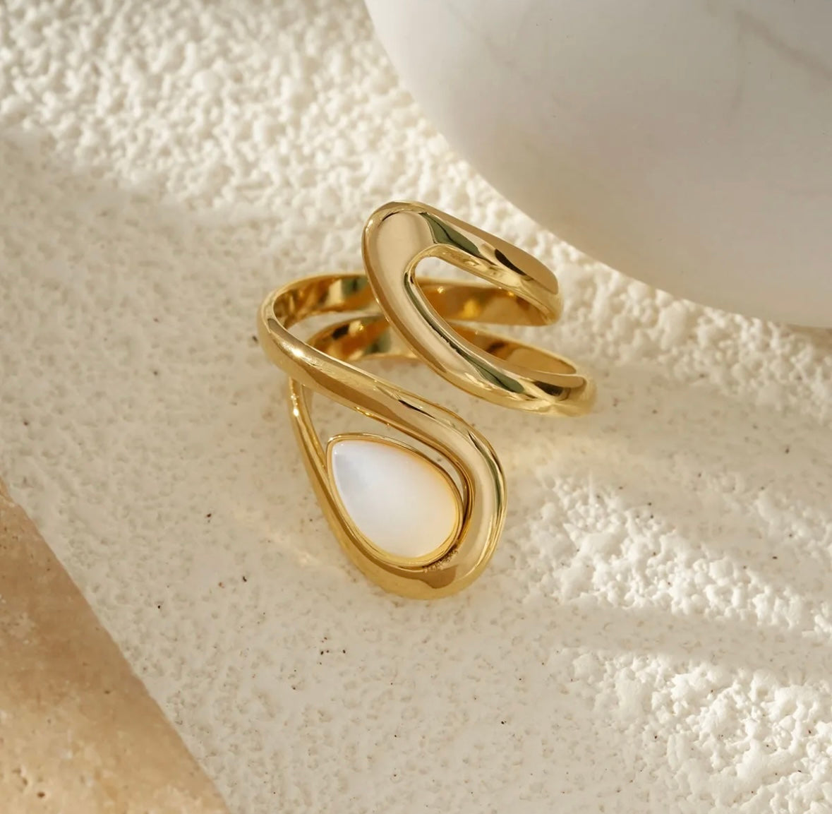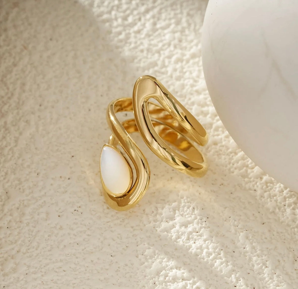 Bague Dorée Ondulation Élégante Avec Pierre Goutte Nacrée. Tous nos produits sont fabriqués en acier inoxydable, un matériel qui résiste à l'eau et au temps. Ils sont garantis sans plomb, nickel et cadmium.