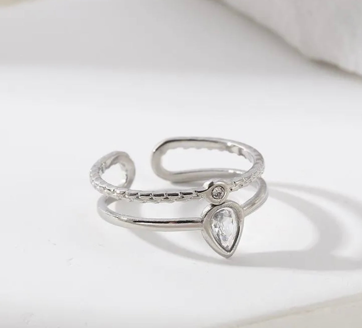 Bague Argentée Large Creuse Avec Strass Goutte Et Petit Rond. Tous nos produits sont fabriqués en acier inoxydable, un matériel qui résiste à l'eau et au temps.