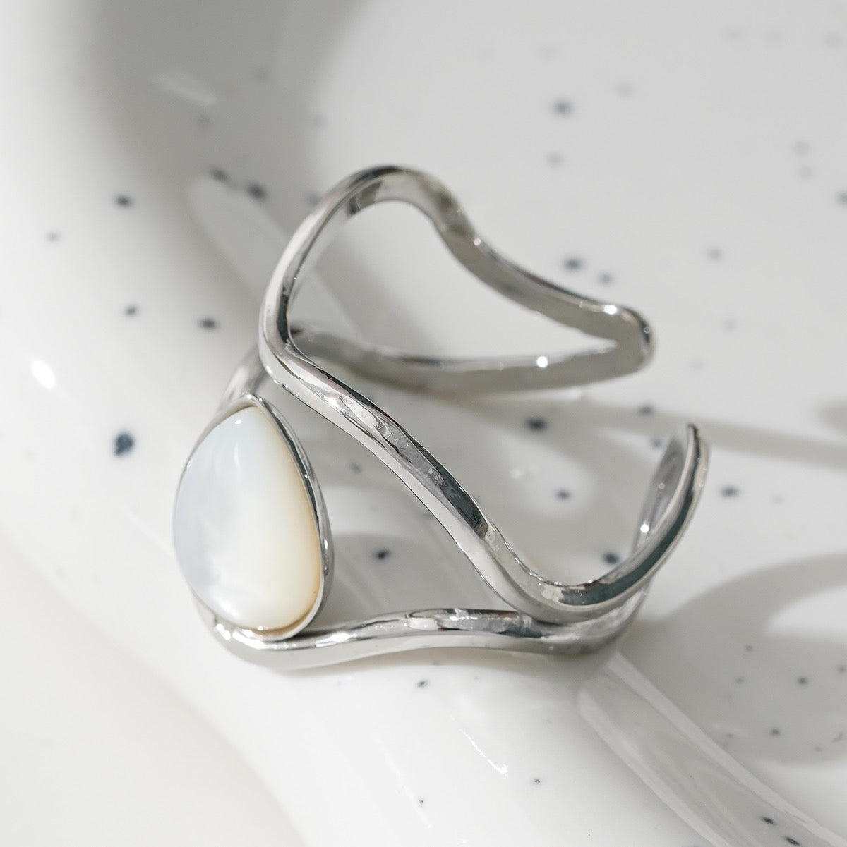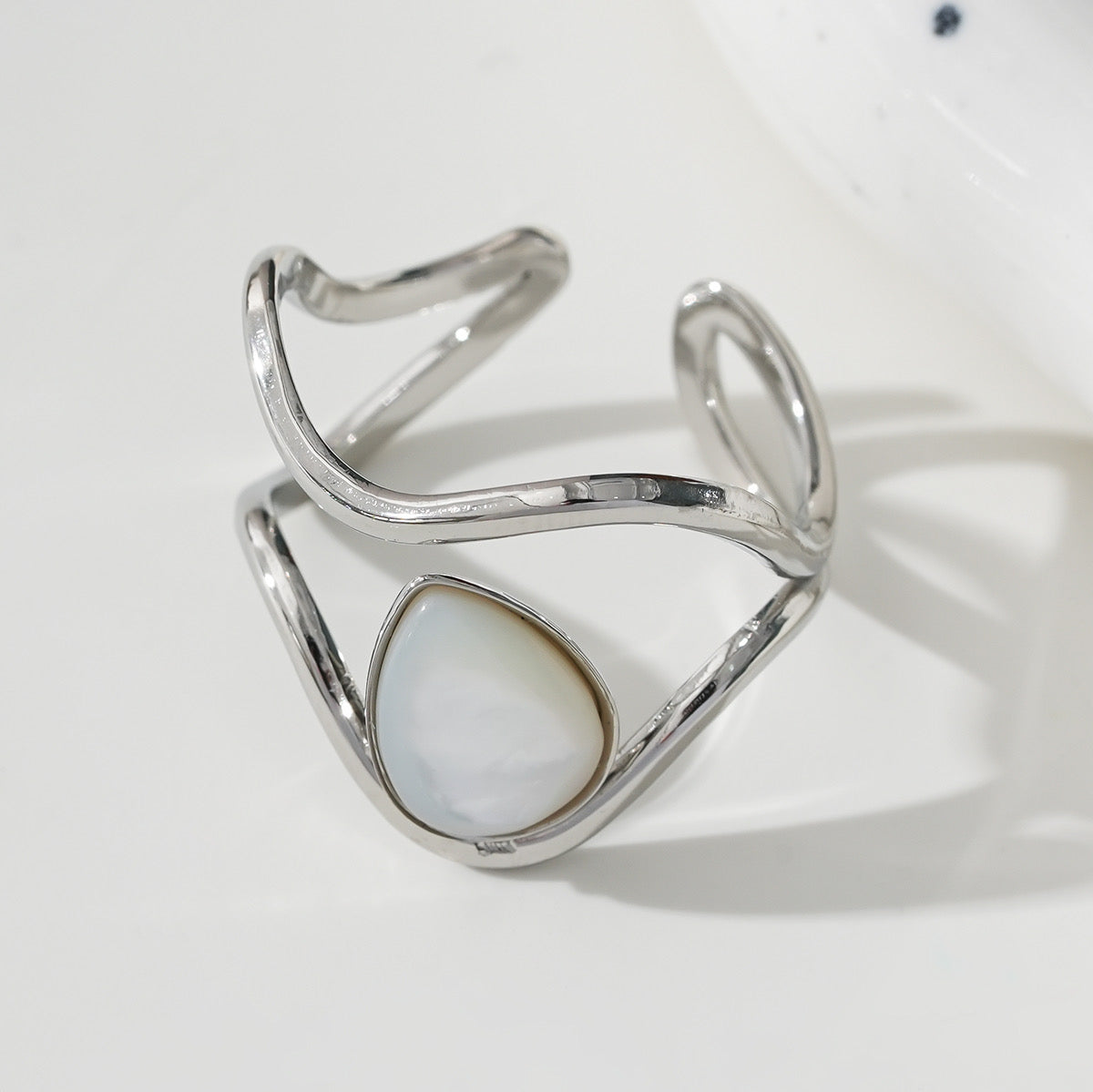 Bague Argentée Ouverte Large Creuse Avec Pierre Goutte Nacre Blanche. Tous nos produits sont fabriqués en acier inoxydable, un matériel qui résiste à l'eau et au temps.