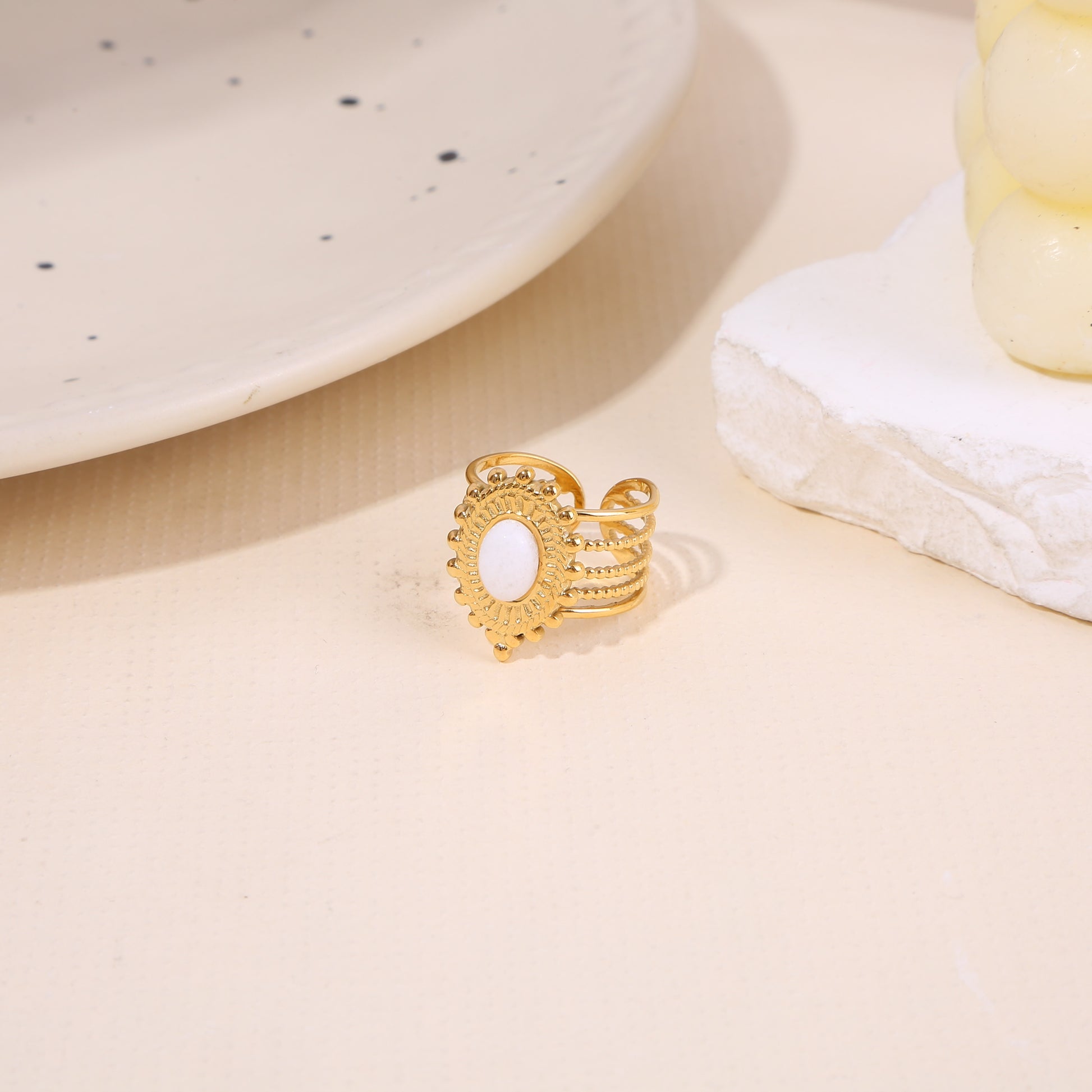 Bague Dorée Ajustable Anneaux Multi Rangs Avec Pierre Soleil Blanche. Tous nos produits sont fabriqués en acier inoxydable, un matériel qui résiste à l'eau et ne se rouille pas dans le temps. Ils sont garantis sans nickel, sans cadmium et sans plomb.