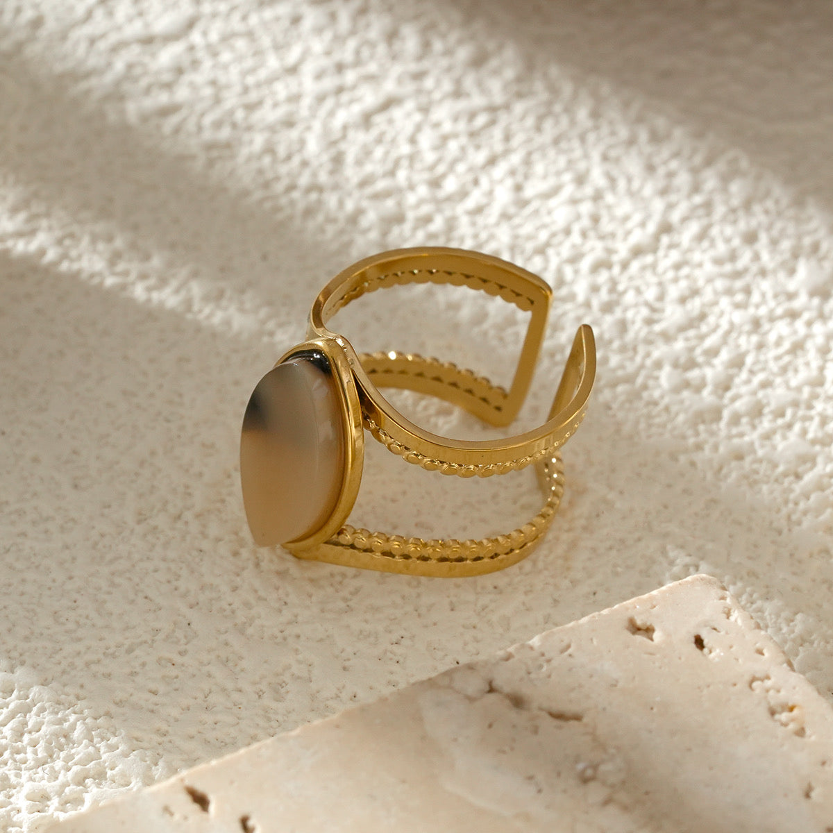 Bague Dorée Ajustable Double Anneau Avec Pierre Naturelle Ovale Motif Léopard. Tous nos produits sont fabriqués en acier inoxydable, un matériel qui résiste à l'eau et au temps. Ils sont garantis sans plomb, nickel et cadmium.