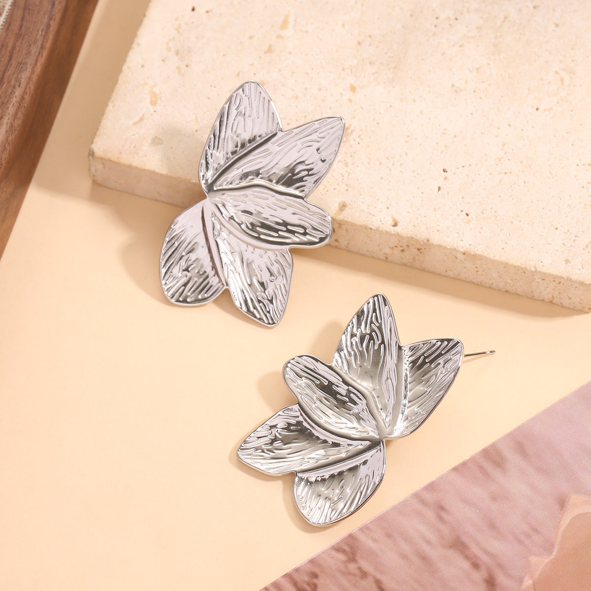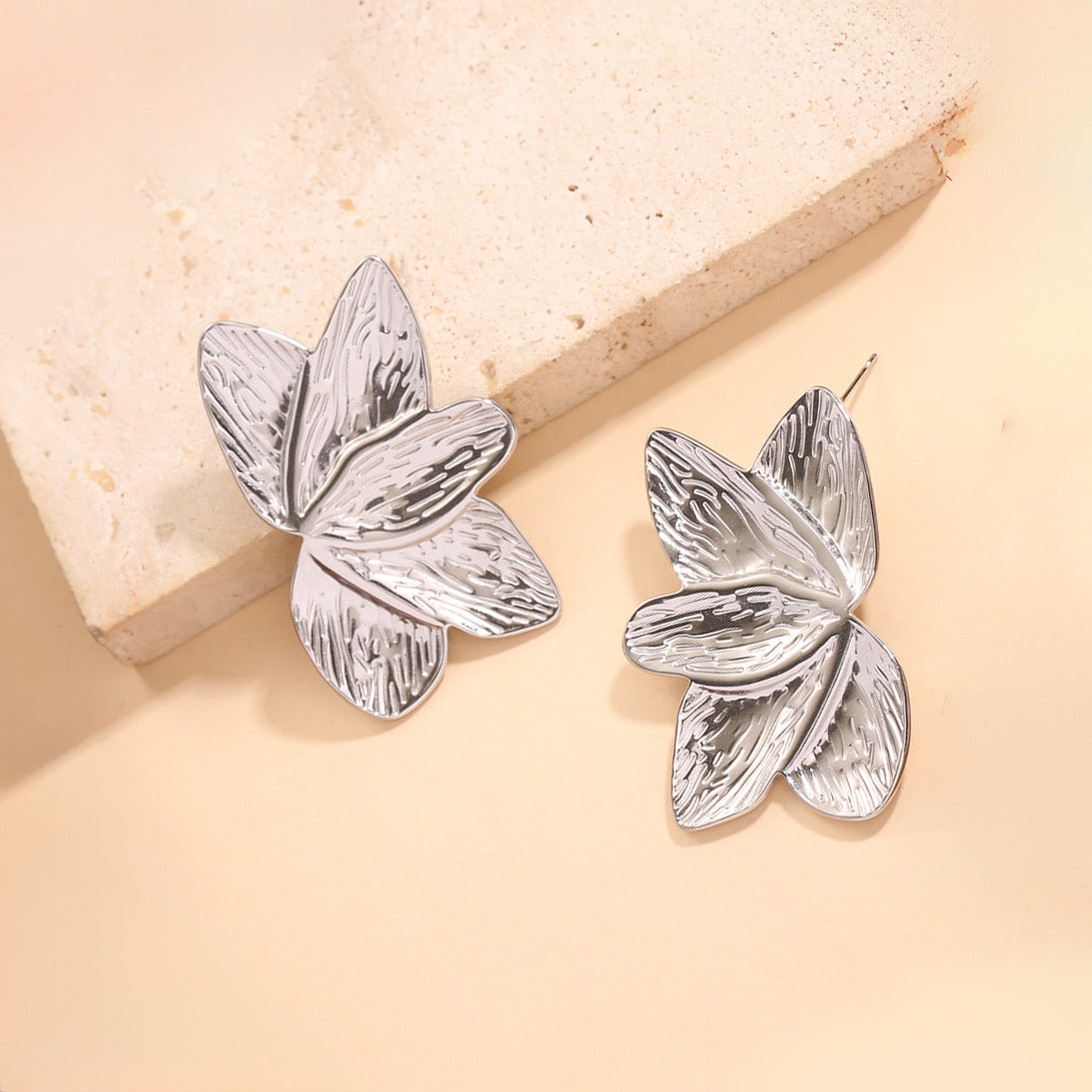 Boucles d'Oreilles Argentées Fleur Sculptée Avec Texture Botanique. Tous nos produits sont fabriqués en acier inoxydable, un matériel qui résiste à l'eau et au temps.
