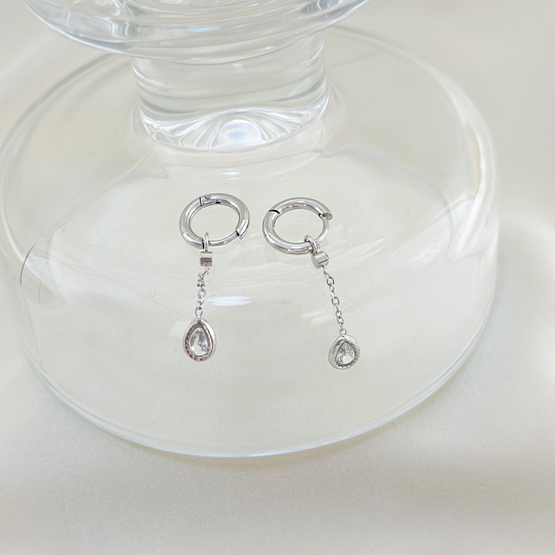 Boucles d'Oreilles Argentées Petites Créoles Avec Pendentifs Strass Gouttes. Tous nos produits sont fabriqués en acier inoxydable, un matériel qui résiste à l'eau et au temps.