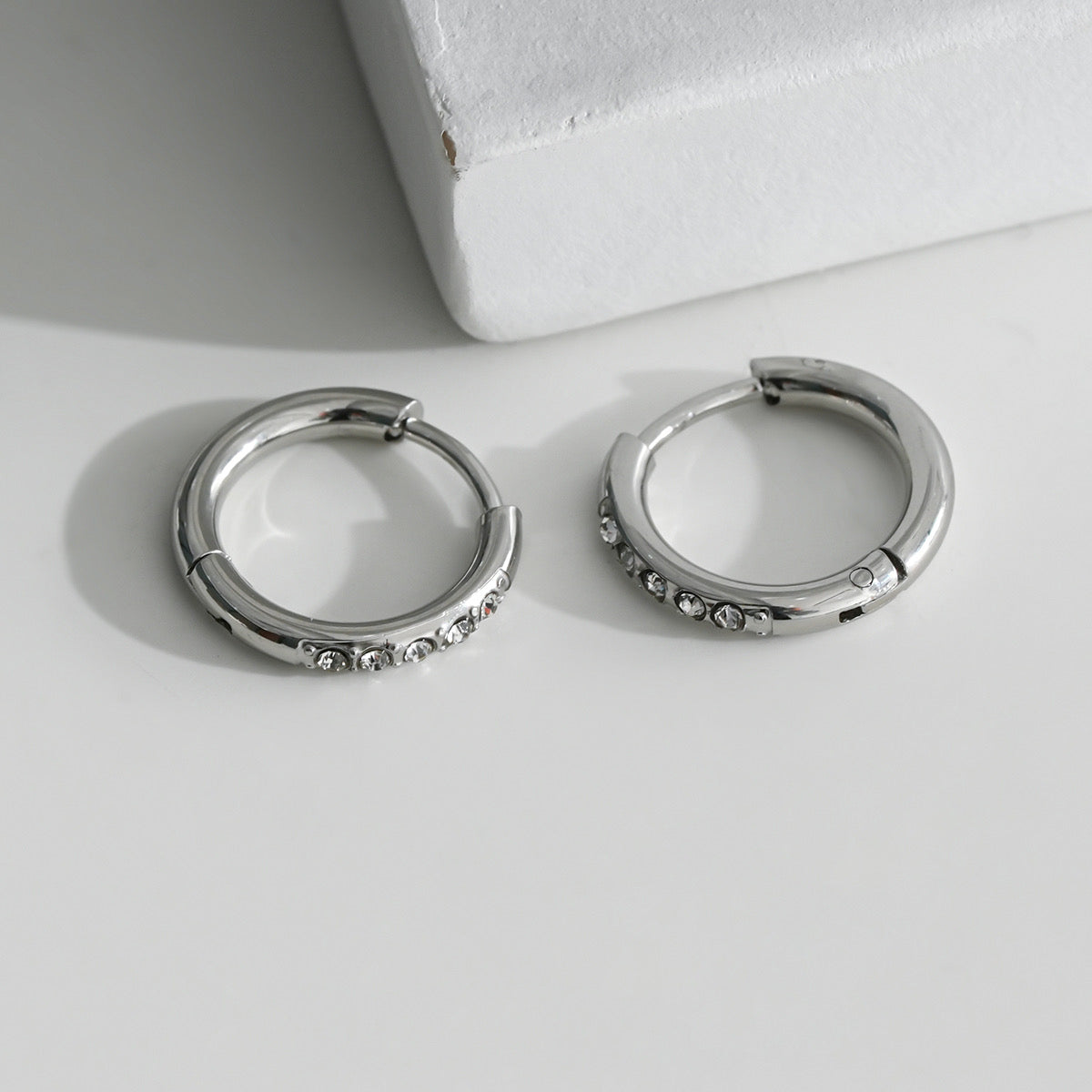 Boucles d'Oreilles Argentées Petites Créoles Incrustées Strass. Tous nos produits sont fabriqués en acier inoxydable, un matériel qui résiste à l'eau et au temps.