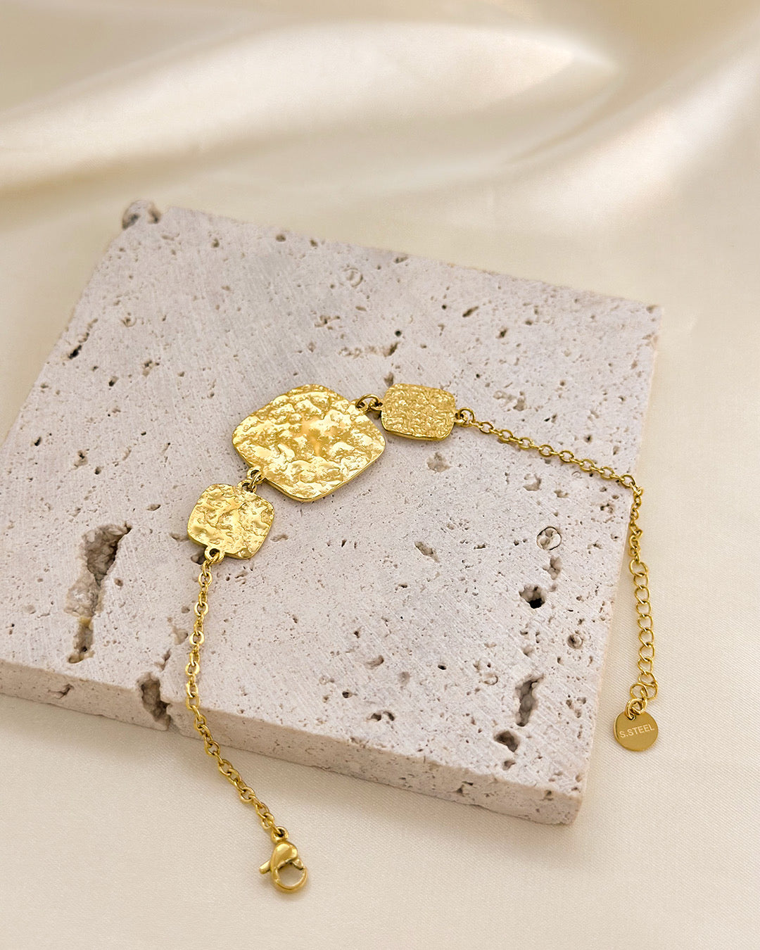 Bracelet Doré Avec Trois Plaques Carrées Martelées . Tous nos produits sont fabriqués en acier inoxydable, un matériel qui résiste à l'eau et au temps.