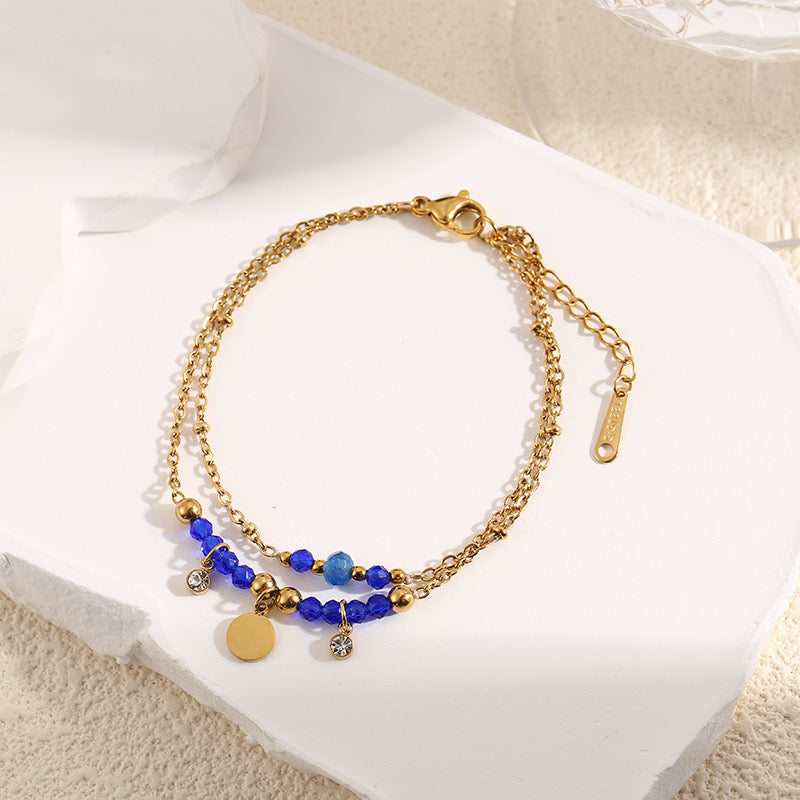 Bracelet Doré Double Chaînes Pierres Bleues Avec Petite Plaque Ronde Et Strass. Tous nos produits sont fabriqués en acier inoxydable, un matériel qui résiste à l'eau et au temps.