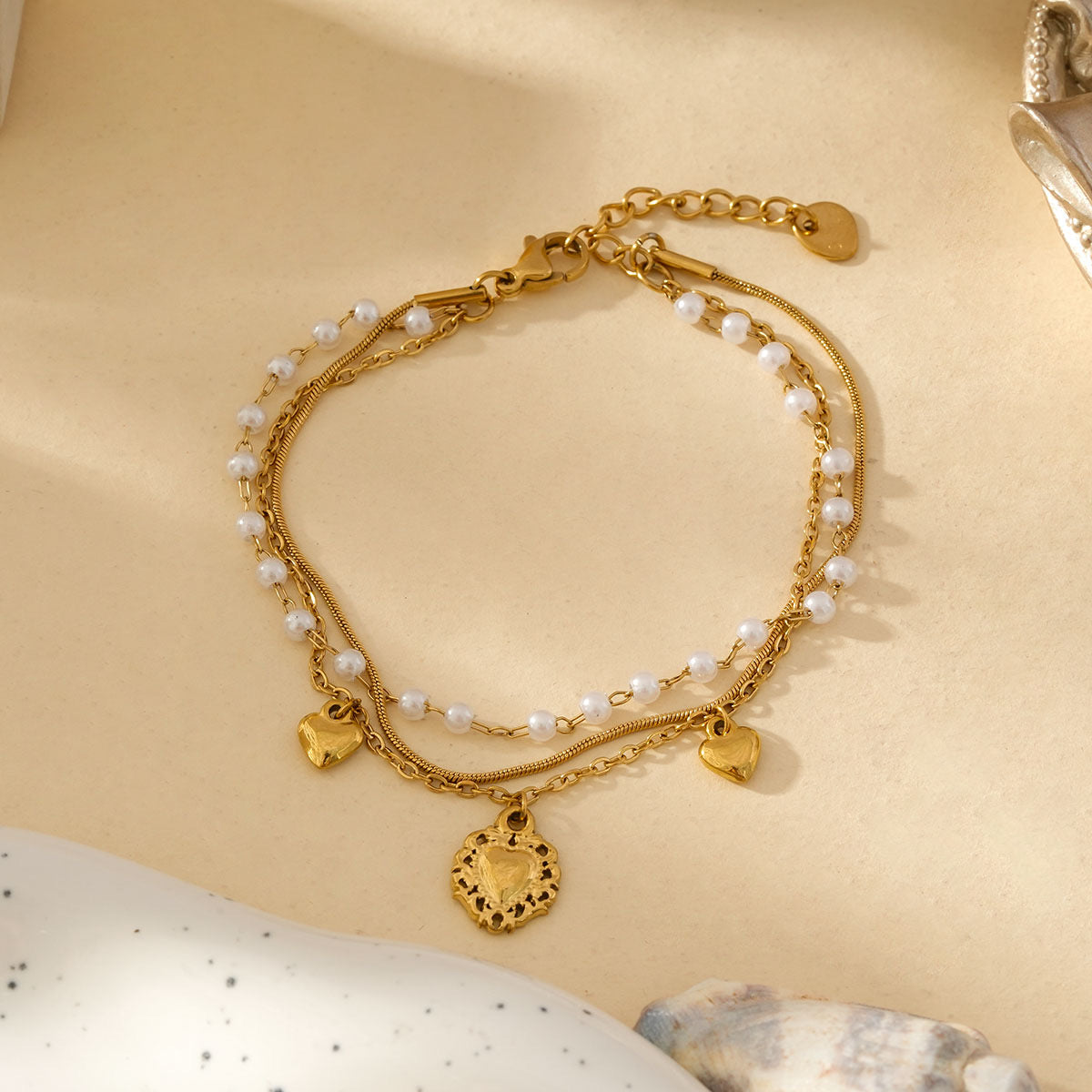 Bracelet Dorée Triple Chaîne Avec Pendentif Cœur Et Perles Blanches
