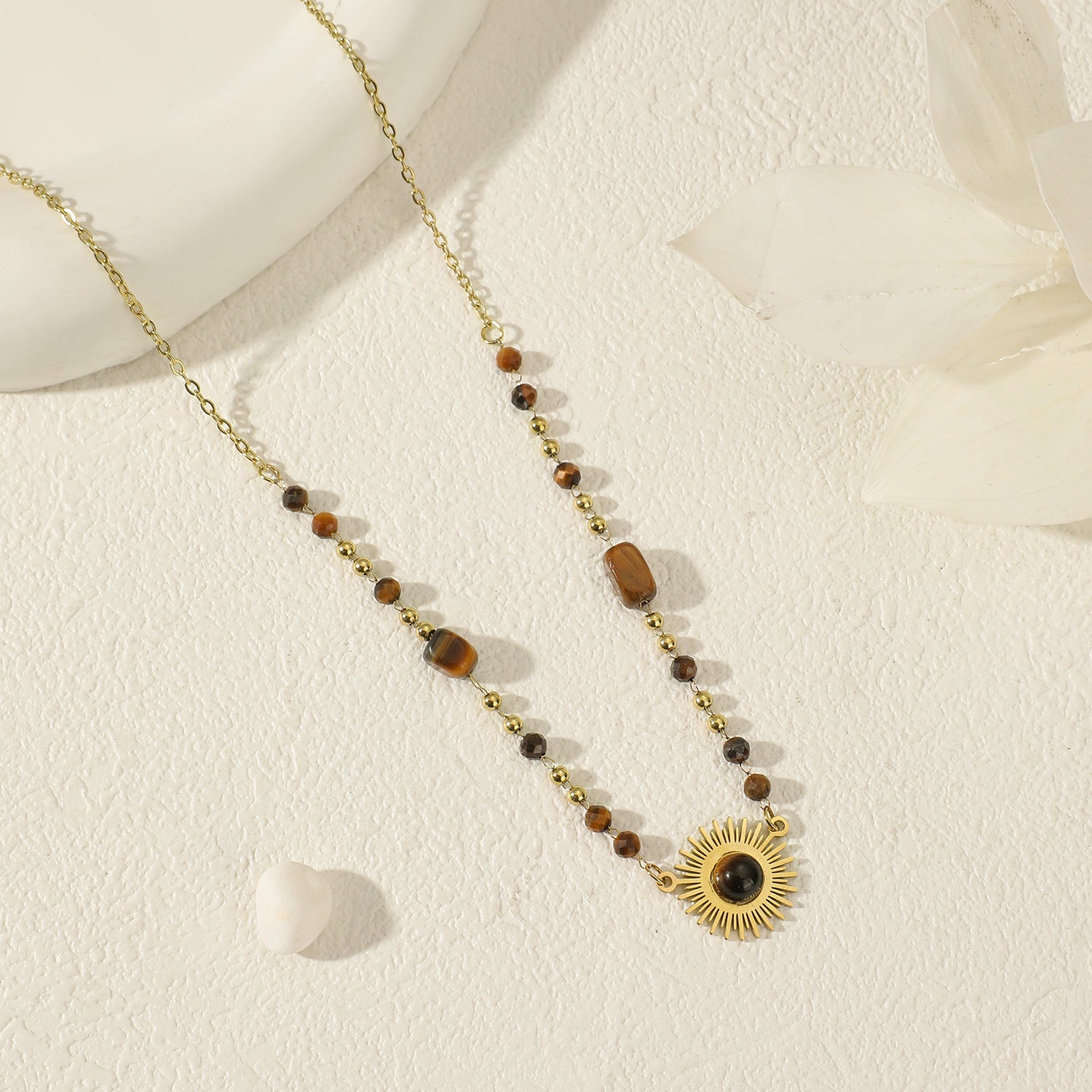 Collier Chaîne Dorée Pierre Œil de Tigre Pendentif Soleil. Tous nos produits sont fabriqués en acier inoxydable, un matériel qui résiste à l'eau et au temps.