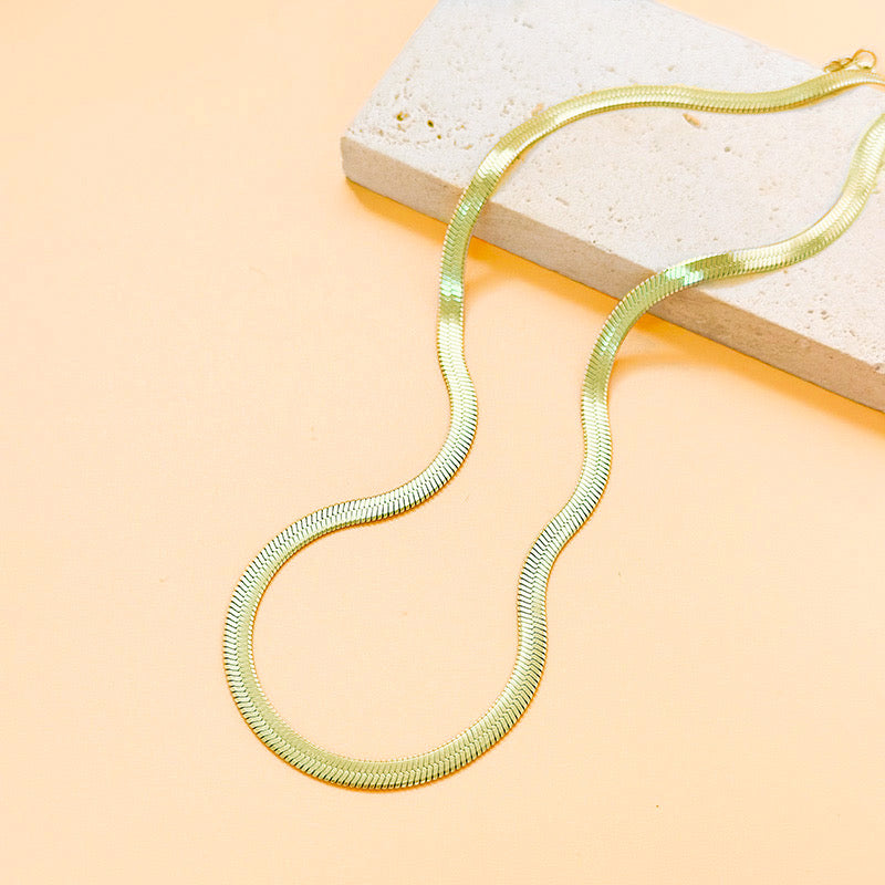 Collier Doré Chaîne Plate Serpent Moyenne 4mm d'épaisseur. Tous nos produits sont fabriqués en acier inoxydable, un matériel qui résiste à l'eau et au temps.